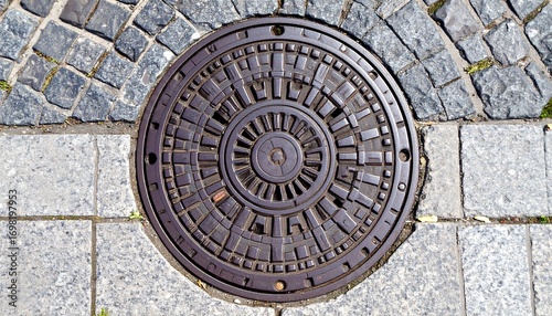 round, metal, manhole, cover, brown, dark, pavement, stone, grey, tile, street, paved, detail, design, geometric, pattern, ornamental, decorative, urban, infrastructure, utility, top, view, closeup, texture, metalwork, engineering, public, area