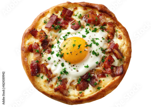 Round, open-faced breakfast pizza with fried egg, bacon, and cheese