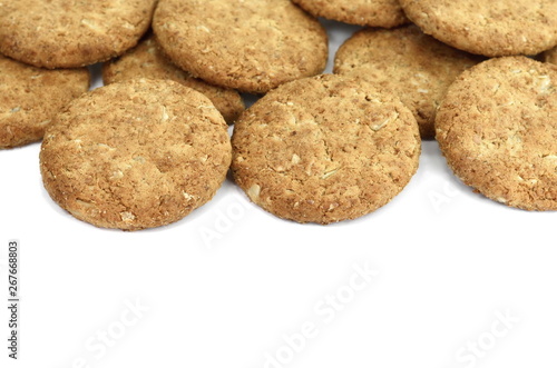 Round whole wheat biscuit, cookie with raisins isolated on white background. Biscuits with whole-wheat (wholemeal) flour isolated on white background