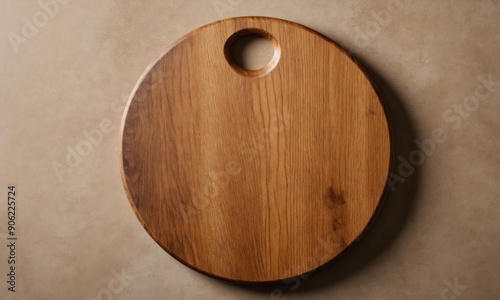 Round wooden cutting board with a hole for hanging, on a brown background