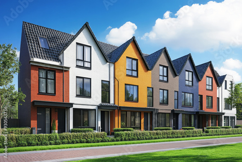 Row of colorful houses standing on sunny street with lush green bushes and trees. New townhouses in neighborhood