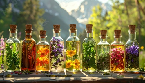 bottle, herb, flower, cork, glasses, natural, rustic, mountain, blurred, background, wooden, weathered, sunlight, plant, greenery, meadow, landscape, floral, herbal, essence, potion, remedy, alternative, medicine, botany, foliage, aromatherapy, wildflower, collection, assortment, nature, organic, ampoule, wellness, health, therapeutic, serene, peaceful, calmness, beauty, vibrant, colourful, still, life, arrangement, decor, countryside, garden, healing