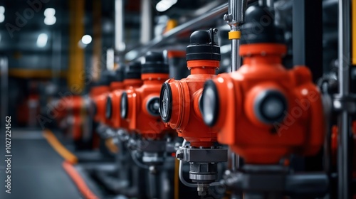 Row of industrial orange valves with pressure gauges in a factory setting, showcasing metal pipes and equipment in a modern manufacturing environment.