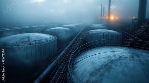 Row of large storage tanks in an industrial facility at dusk, surrounded by fog, creating a mysterious and atmospheric scene with soft lighting and industrial aesthetics.