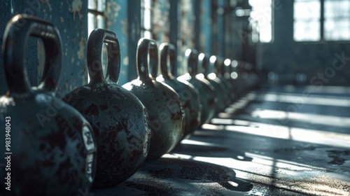 Row of Old Kettlebells in a Dimly Lit Gym with Dust and Shadows