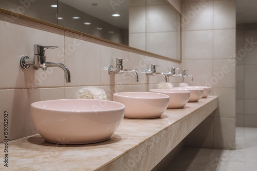 sink, bathroom, faucet, pink, vessel, marble, counter, hygiene, interior, design, clean, tile, mirror, water, chrome, modern, washroom, lavatory, indoor, plumbing, surface, fixture, basin, sanitary, facility, row, line, ceramic, light, bright, pastel, arrangement, neat, orderly, sanitation, personal, care, cleanliness, vanity, elegance, hotel, spa, public, space, perspective, minimal, contemporary
