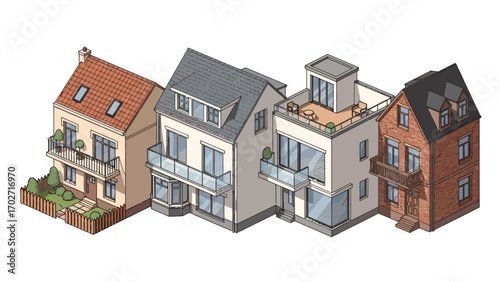 Row of varied houses in isometric vector style showcasing diverse architectural design.