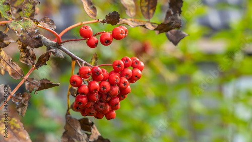 Rowan berries on a branch. Autumn harvest. Ripe red rowan berries on a tree branch.