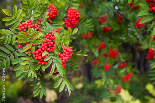 Rowan berries on rowan tree. Sorbus aucuparia.
