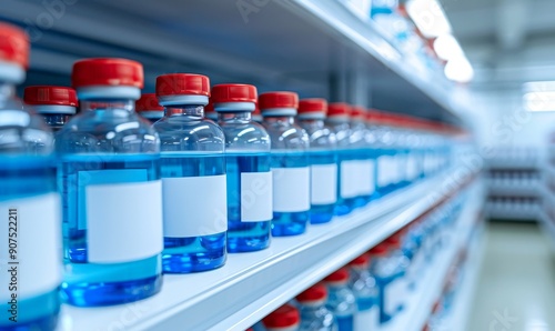 rows of blue liquid in bottles on shelf in laboratory - scientific research, chemical experiment, pharmaceutical industry, medical development, health