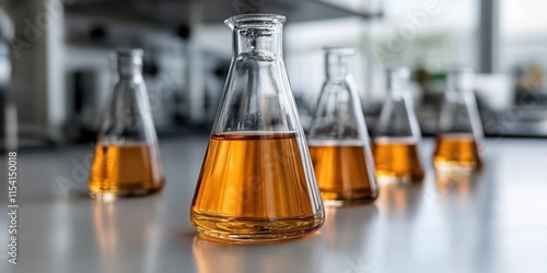 Rows of Erlenmeyer flasks with amber liquid on a lab table, indicating scientific research in a modern laboratory.