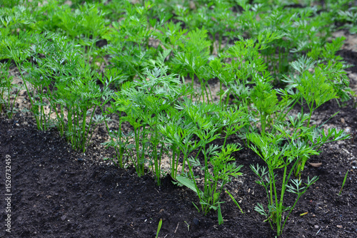 Rows of Freshly Grown Carrot Plants in a Garden Bed
