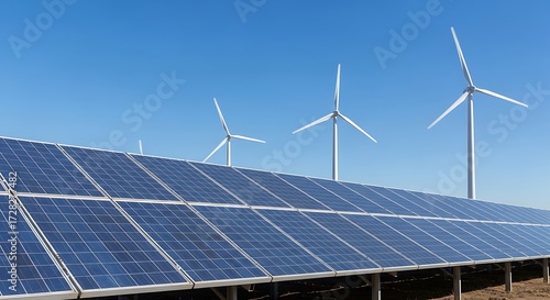 Rows of solar panels in the foreground with wind turbines in the background under a clear blue sky, representing renewable energy sources