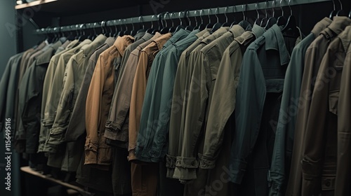 Rows of stylish trench coats in earthy tones, hanging on sleek wooden racks