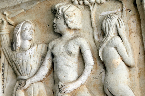 Royal Abbey of Fontevraud. Carved capital. Adam and Eve.. Fontevraud. France.