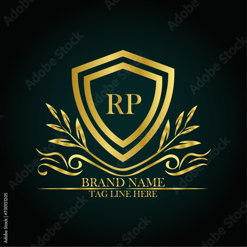 RP luxury letter logo template in gold color. Elegant gold shield icon. Modern vector Royal premium logo template vector