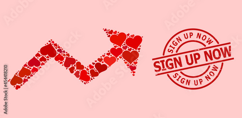 Rubber Sign up Now stamp, and red love heart collage for growing trend arrow. Red round stamp contains Sign up Now caption inside circle. Growing trend arrow collage is formed with red wedding icons.