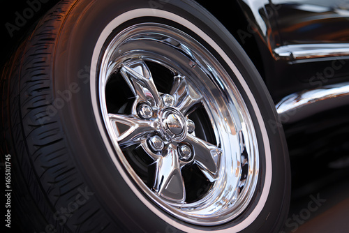 rim, tire, vehicle, shiny, chrome, metal, rubber, glossy, alloy, automotive, wheel, round, surface, black, finish, modern, performance, sporty, machine, engineering, light, durability, elegant, transportation, innovation, equipment, precision, clean, speed, hard-wearing, sleek, traction, rotation, tread, craftsmanship, construction, accessory, rubberized, detail, style, motion