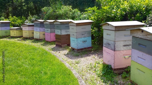 honeycomb, bee, honey, apiary, hive, nature, box, apiculture, forest, grass, insect, agriculture, green, summer, field, farm, meadow, house, rural, blue, outside, yellow