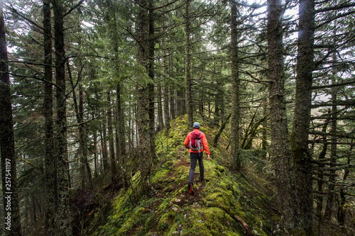 RUCKEL RIDGE, OREGON. A man hiking alone in the woods climbs a mossy ridge on a foggy, misty afternoon.