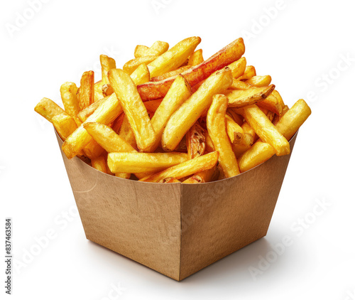 Ruddy crispy appetizing French fries in a cardboard package isolated on a white background. Fried potatoes
