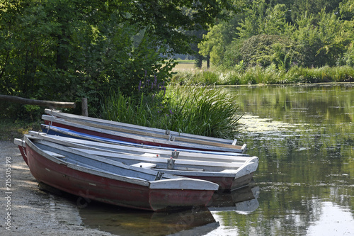 ruderboote am teichufer im landschaftspark schönbusch bei aschaffenburg