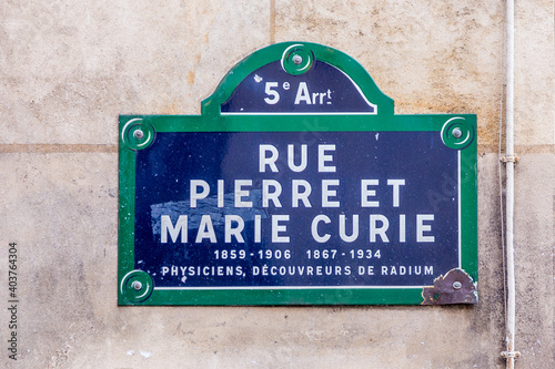 Rue Pierre et Marie Curie - old street sign in Paris