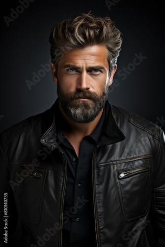 beard, leather jacket, rugged, photogenic, man, portrait, dark background, facial hair, fashion, style, moody, intense, brooding, serious, masculine, model, studio, dramatic, lighting, bold, confident, gritty, tough, edgy, grunge, hipster, urban, mysterious