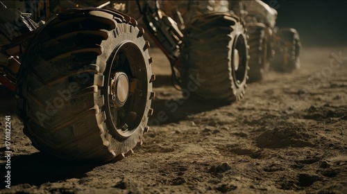 tire, offroad, construction, machinery, exploration, vehicle, dirt, sunlight, dawn, dusk, rugged, hard-wearing, wheel, design, challenge, environment, desert, jungle, mars, strength, resilience, adventure, engineering, nature, beauty, elegance, grit, modern, advance, terrain, frame, sharpened, blur, composition, lighting, mood, raw, severe, constructive, action
