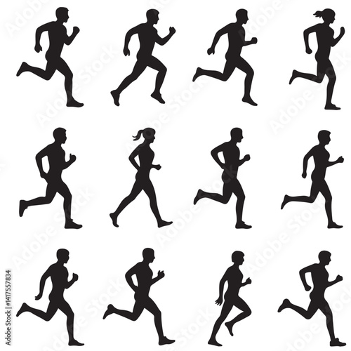 runner, silhouette, action, athletic, champion, competition, exercise, fitness, group, human, jogging, marathon, profile, race, training, male, collection, set, young, vector, woman, man, icon, girl, healthy, walk, speed, man, woman