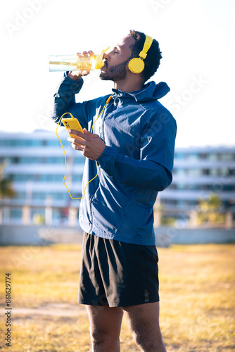 runner, male, athlete, man, bottle, fitness, exercise, active, body, healthy lifestyle, jogger, healthy, outside, relaxation, sport, listening, strong, trainer, strength, people, water, wellness, marathon, muscular, bodycare, physical, urban, drinking, earphones, break, refreshing, rest, alone, profile, calm, confident, health care, focused, music, satisfied, standing, using, up, warm, high-coloured, physical exercise, video, hispanic