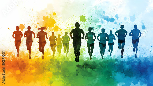runner, vibrant, figure, exercise, energy, success, silhouette, race, lifestyle, group, dynamic, background, motion, splatter, achievement, illustration, movement, people, speed, victory, running, human, marathon, design, motivation, sport, abstract, teamwork, competition, determination, endurance, paint, inspiration, art, graphic, splash, watercolor, colourful, fitness, healthy, active, athletic