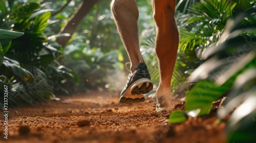 Runner's legs in action, surrounded by green plants on dirt path. Runner's legs go fast on a green path with eco shoes.