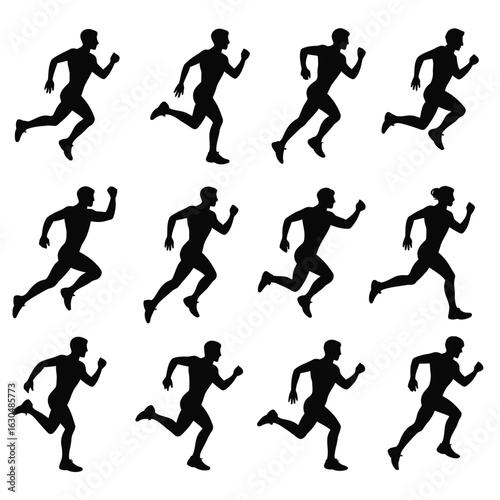 running, figure, silhouette, people, athlete, motion, sport, action, black, white, dynamic, athletic, movement, speed, race, competition, training, exercise, fitness, track, marathon, sprint, jump, stride, pose, sequence, illustration, graphic, design, modern, simple, clean, vector, male, female, group, collection