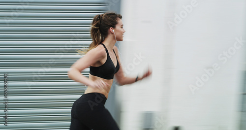 Running, fitness and woman on street, city and practice for marathon in morning, exercise and blurred. Healthy, runner and person on road for workout, athlete and training with energy for sports