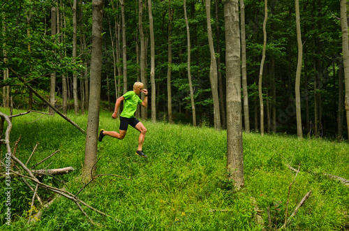 Running in green nature. Trail run in green rainy forest