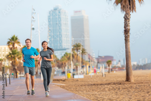 Running man and woman couple jogging on Barcelona Beach, Barceloneta. Healthy lifestyle people runners training outside on boardwalk. Multiracial couple, Asian woman, Caucasian fitness man working out