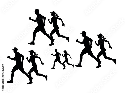 Running Silhouettes of Men and Women in Various Running set vector design Positions, A repeating pattern of black silhouettes of men and women running, pattern, sports apparel, activewear, active life