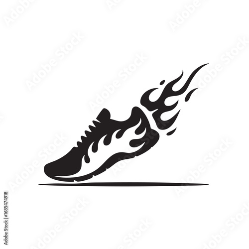 sneaker, shoe, footwear, trainer, running, jogging, sport, athletic, fitness, exercise, marathon, sprint, training, gym, physical exercise, silhouette, vector, graphic, design, symbol, icon, black, outline, apparel, sole, fast, speed, motion, flames, fire, energy, dynamic, race, competition, track, stylish, modern, abstract, performance, active, foot, logotype, line, art