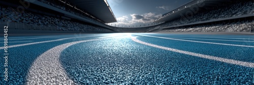 Running track with blue surface under bright sky at a large stadium in the afternoon