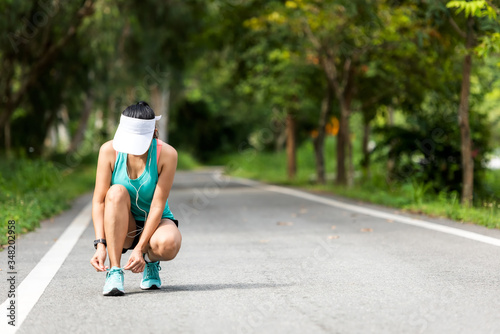 Running woman tying laces of running shoes before jogging through the road in the workout nature park. Weight Loss and Healthy Concept