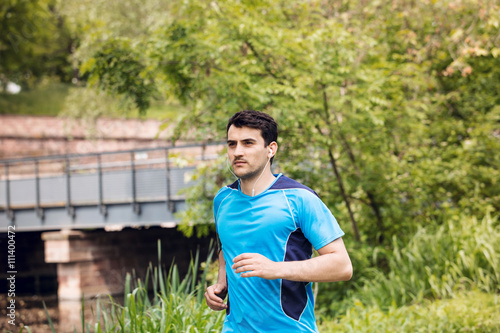 Running workout man with mp3 music player listening to music with mp3 player armband with smart mobile phone.