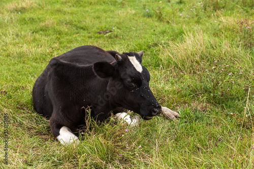 Rural cows graze on a green meadow. Rural life. Animals. agricultural country