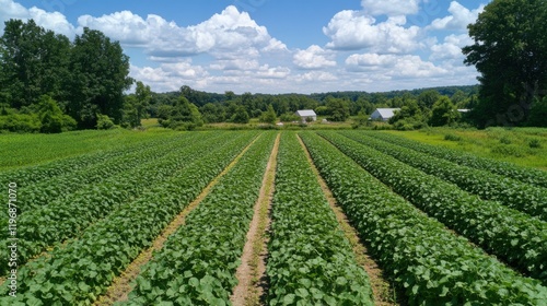 farmland, agriculture, crop, field, rural, summer, sky, cloud, green, plant, row, planting, cultivation, farming, countryside, landscape, aerial, view, barn, building, tree, foliage, vegetation, nature, outdoors, day, sun, bright, agricultural, harvest, growing, dirtied, ground, land, farm, rural scene, country, scene, image, photo, picture, photo, natural, environment, ecosystem, healthy, palmy, abundant