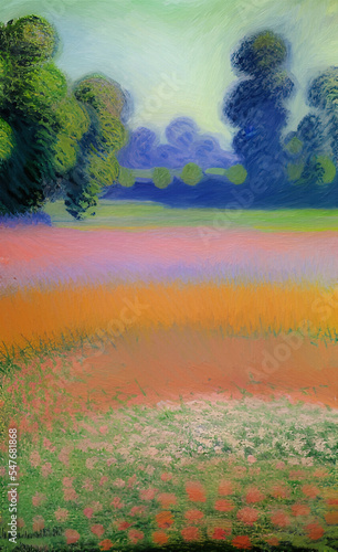 Rural landscape, field of flowers, lavender provence view. Village nature. Digital art illustration.