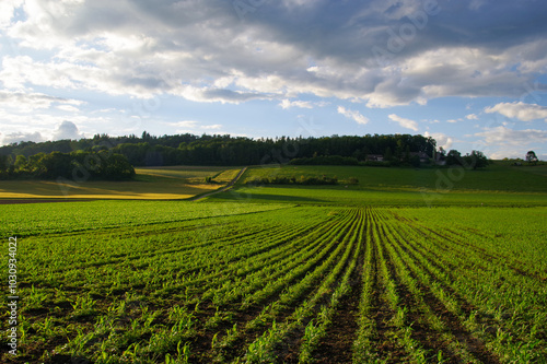 Rural landscape in Switzerland, cultivated fields.