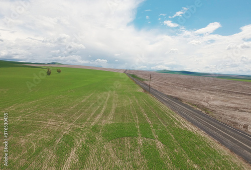 field, landscape, sky, road, nature, grass, rural, green, countryside, agriculture, blue, country, summer, hill, meadow, cloud, farm, cloud, tree, horizon, travel, view, land, spring, farmland