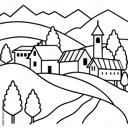 village, rural, landscape, outline, colouring, book, page, line, art, drawing, countryside, farmhouse, scenery, country, home, nature, simple, vignetting, black, white, illustration, doodle, design, artwork, minimalist, outdoors, pastoral, tranquil, serene, field, barn, tree, field, road, farm, settlement, scenic, homestead, architecture, peaceful, charming, creative, countryside