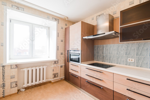 Russia, Moscow- July 06, 2019: interior room apartment. standard repair decoration in hostel. kitchen and dining room