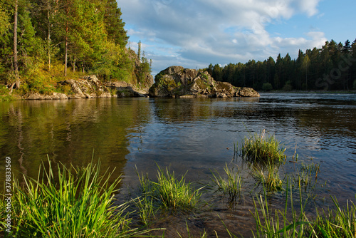 russia, siberia, stone, coast, river, water, fast, source, mountain, forest, taiga, sun, evening, nature, landscape, heat, autumn, sky, tree, blue, tree, summer, cloud, green, fall, grass, park, cloud, outdoors, duck pond, beauty